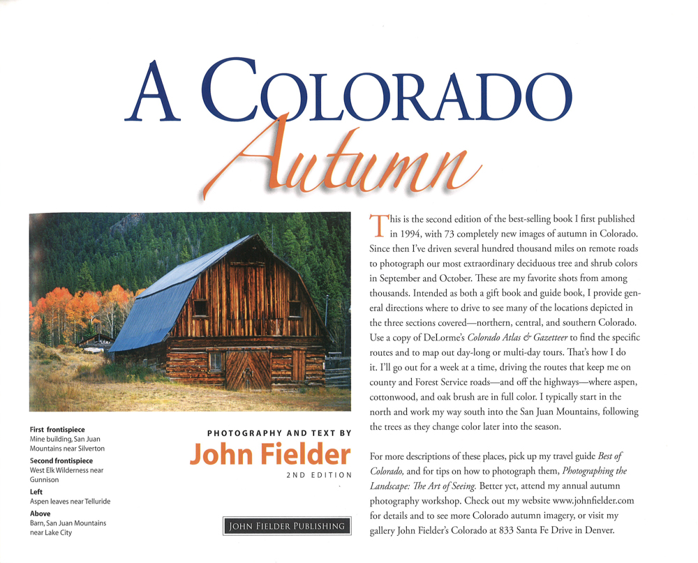 This is the second edition of the best-selling book first published in 1994, with 73 completely new images of autumn in Colorado. Since 1994 John has driven several hundred thousand miles on remote roads to photograph Colorados most extraordinary deciduous tree and shrub colors in September and October, and these are his favorite shots from among thousands. This is intended to be both a gift book and guide book. In each of three sectionscovering northern, central, and southern ColoradoJohn provides general directions where to drive to see many of the locations depicted.